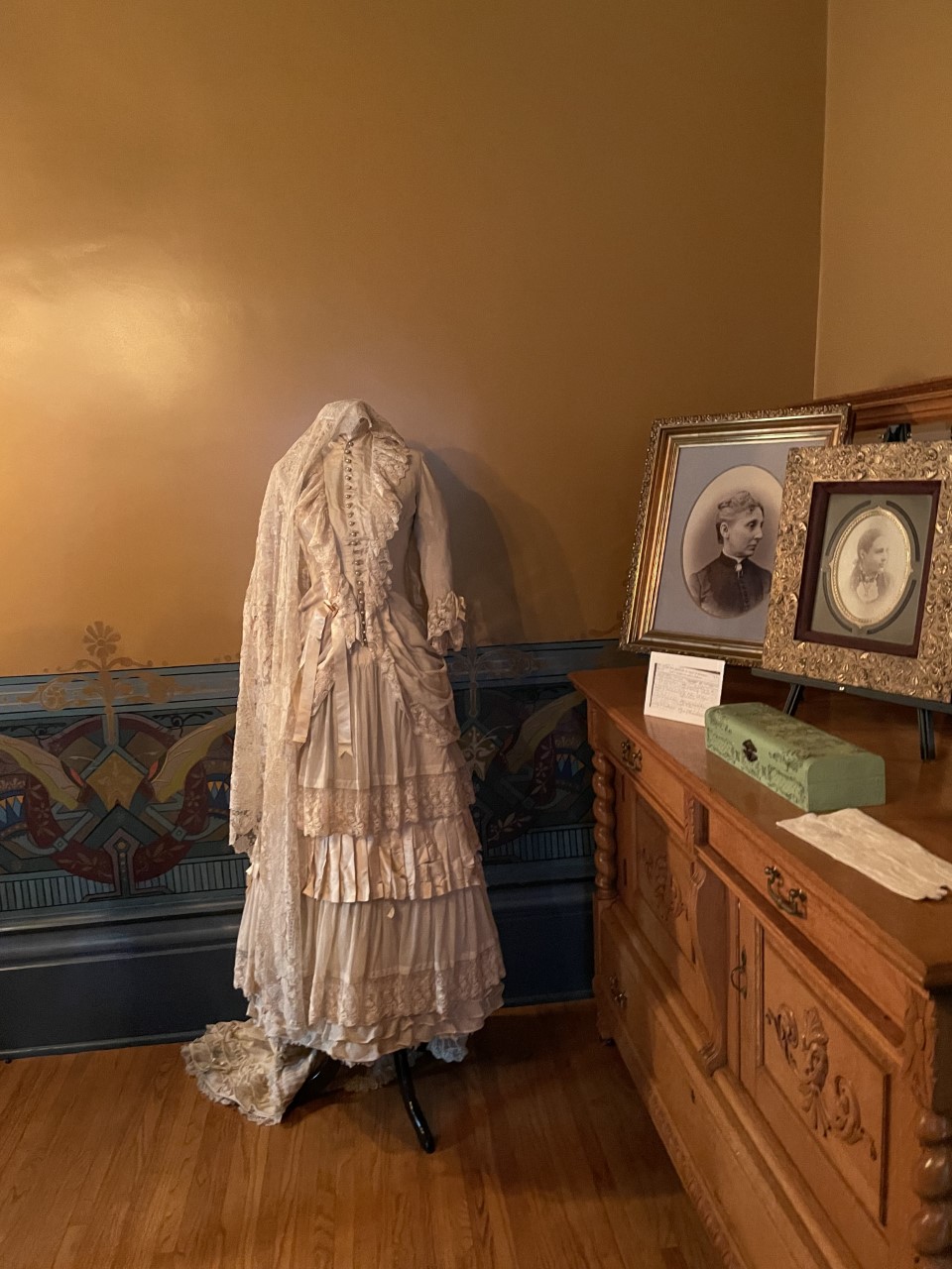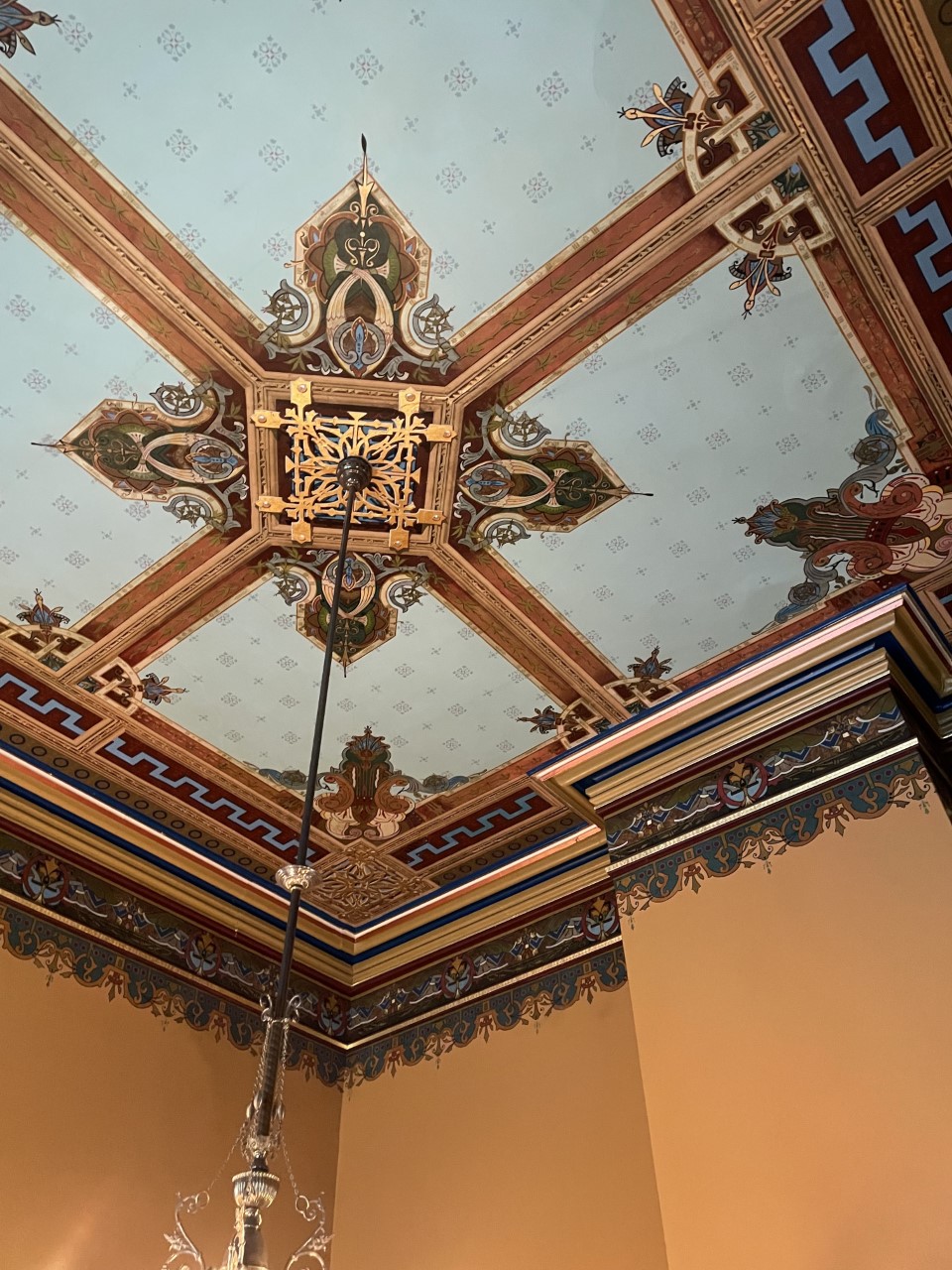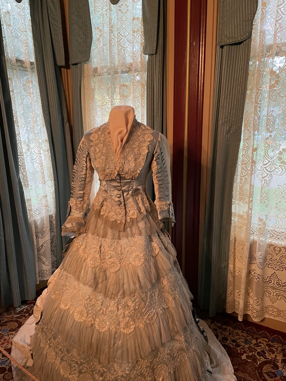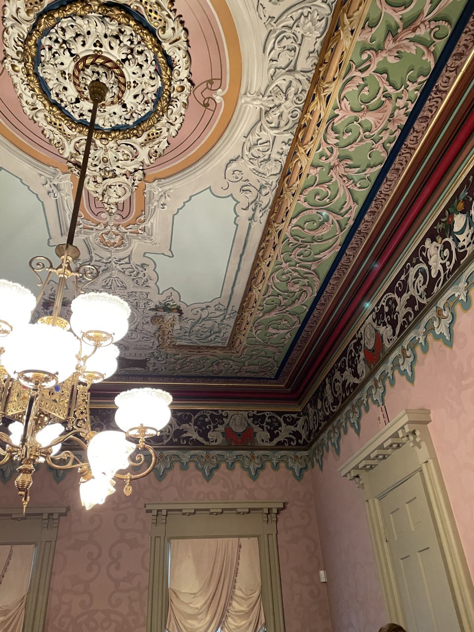 I enjoyed looking at all of these beautiful antique cars and imagining the characters in my books driving around in them. The novel I’m currently writing takes place in the Gilded Age when cars were just coming into use, so the timing of this trip was perfect. And the last stop on our journey just happened to be at a beautiful Gilded Age mansion in Marshall, Michigan. Look at these gorgeous hand-painted ceilings and walls! And gowns! I was in research heaven!