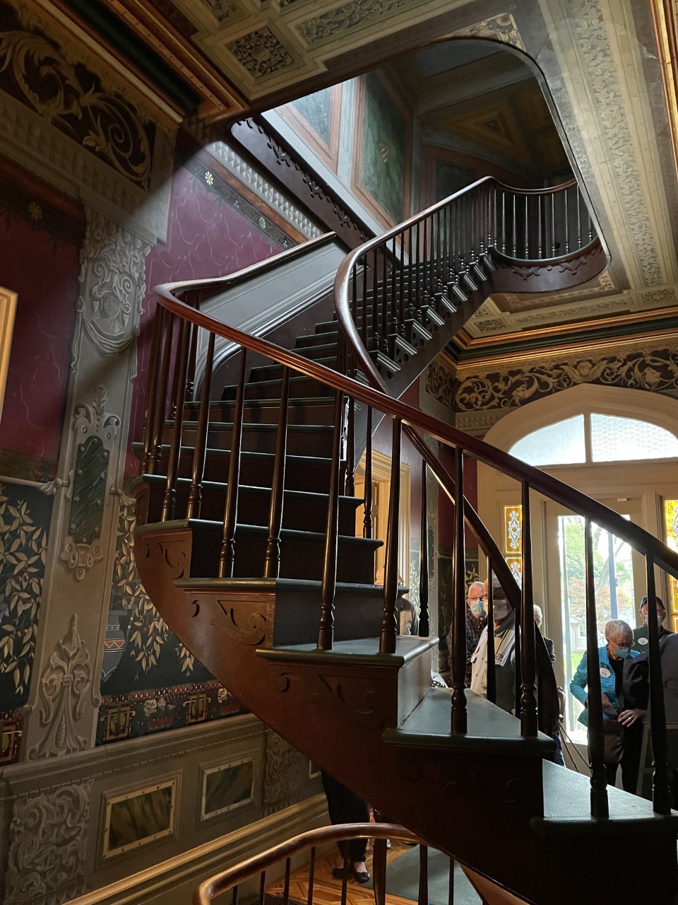 I enjoyed looking at all of these beautiful antique cars and imagining the characters in my books driving around in them. The novel I’m currently writing takes place in the Gilded Age when cars were just coming into use, so the timing of this trip was perfect. And the last stop on our journey just happened to be at a beautiful Gilded Age mansion in Marshall, Michigan. Look at these gorgeous hand-painted ceilings and walls! And gowns! I was in research heaven!